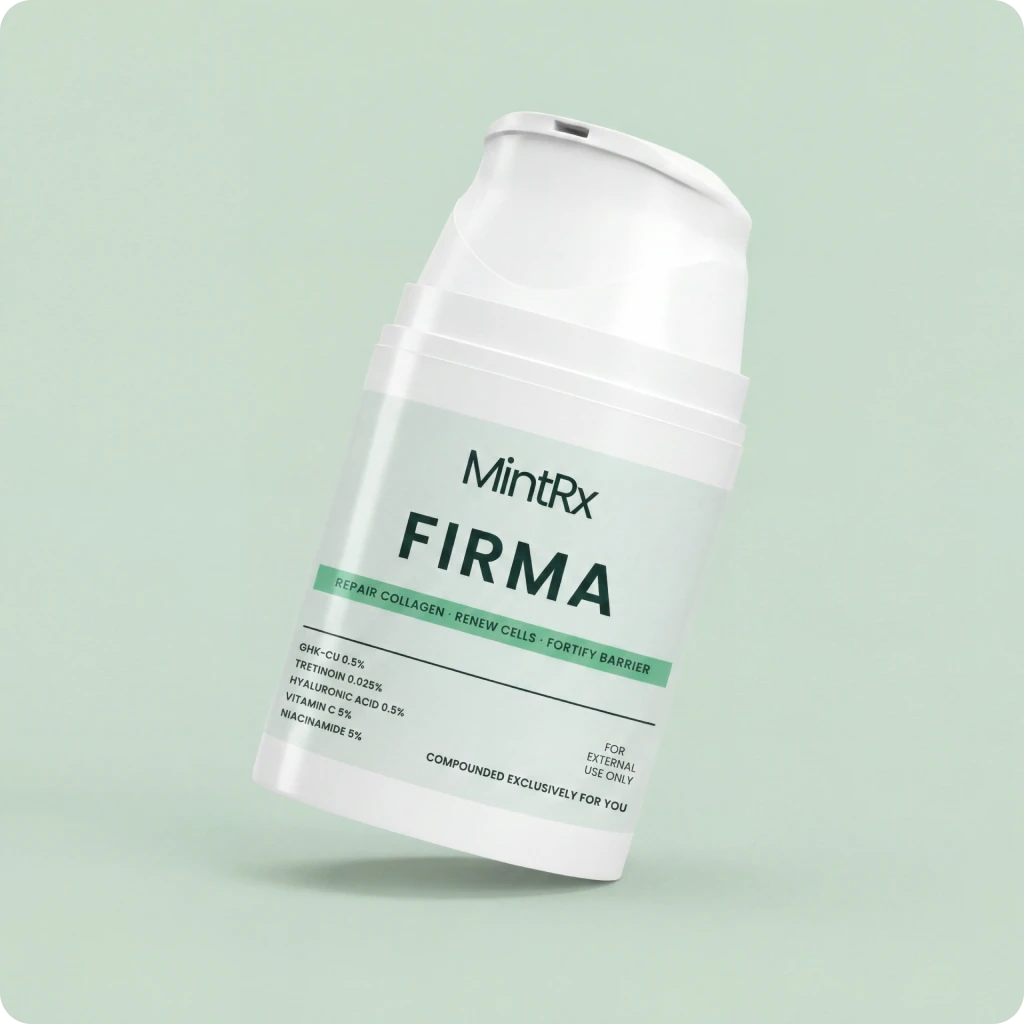 FIRMA pairs prescription-strength GHK-Cu 0.5% with four supporting actives — Tretinoin, Hyaluronic Acid, Vitamin C, and Niacinamide — in a single cream compounded fresh in a U.S.-based licensed pharmacy.